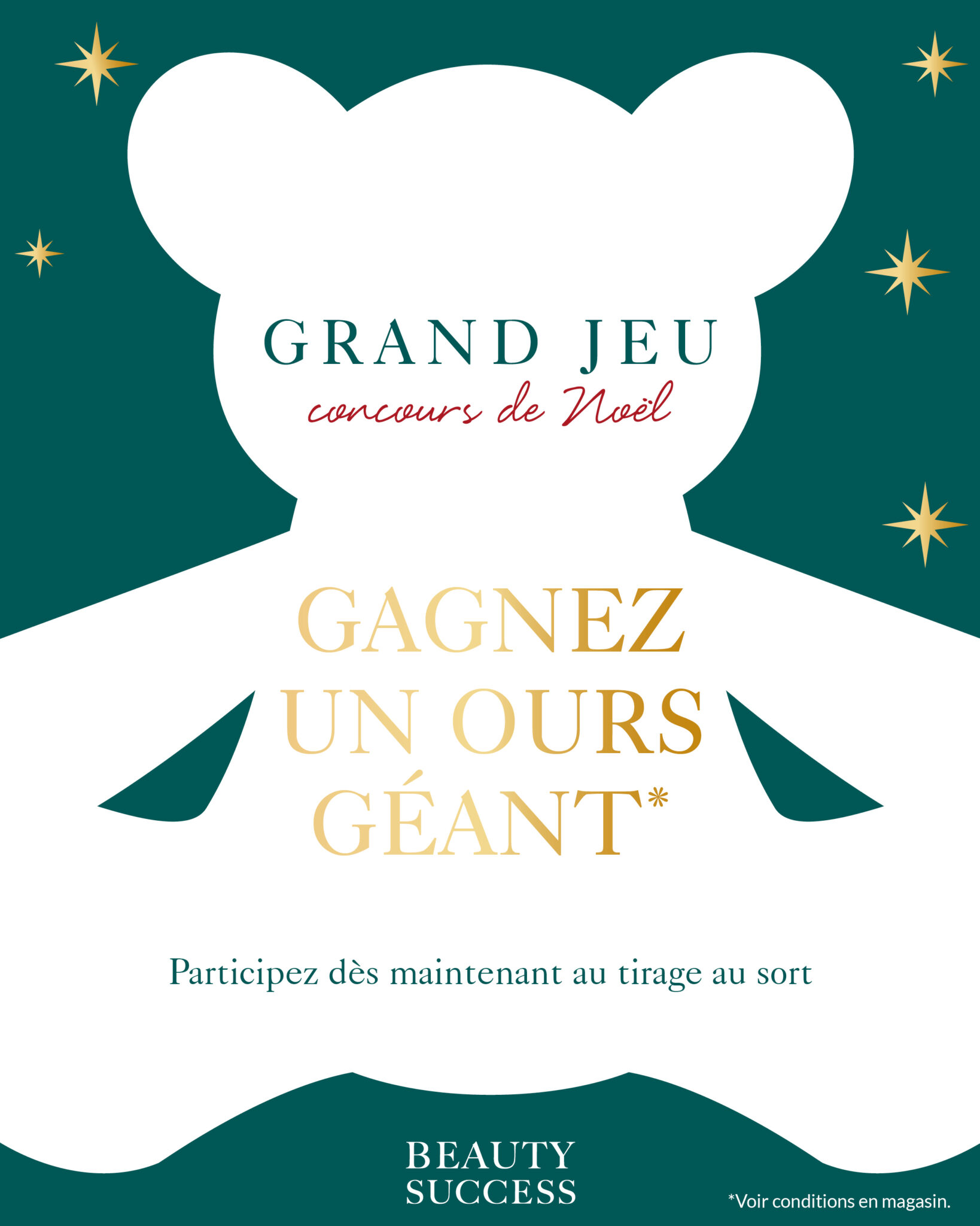 Voir la boutique : Beauty SuccessJusqu’au 20 décembre, tentez de gagner notre ours GEANT Beauty Success*. Pour participer, rendez-vous vite dans votre parfumerie-institut Beauty Success ! *Voir conditions et règlement en magasin.