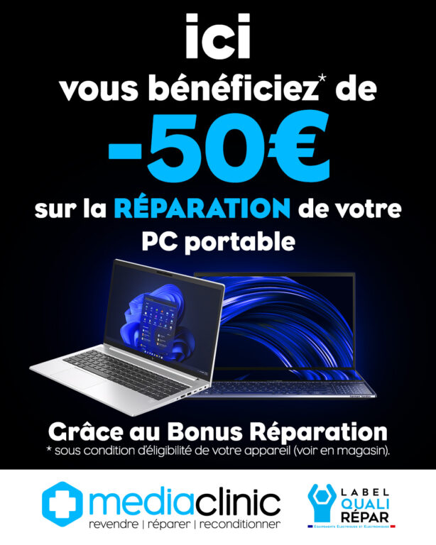 Remise sur les réparations ! Voir la boutique : Média clinic Bénéficiez de -25 euros à -50 euros grace au bonus de réparation Qualirepar !